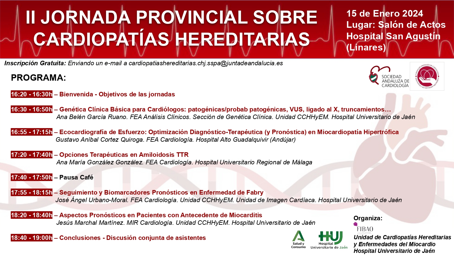 La Fundación para la Investigación Biosanitaria de Andalucía Oriental - Alejandro Otero (FIBAO) y la Unidad de Cardiopatías Hereditarias y Enfermedades del Miocardio del Hospital Universitario de Jaén, organizan la II Jornada Provincial sobre Cardiopatías Hereditarias el 15 de Enero de 2024, de 16:20 a 19h en el Salón de Actos del Hospital de San Agustín (Linares).