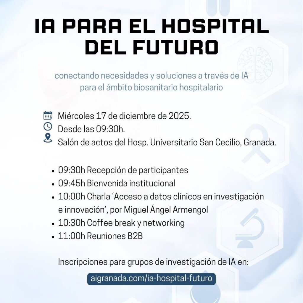 El 17 de diciembre se llevará a cabo el evento “IA para el Hospital del Futuro”, un encuentro diseñado para unir a las Unidades de Gestión Clínica (UGC) del Hospital Universitario San Cecilio con grupos de investigación en Inteligencia Artificial y Ciencia de Datos.
