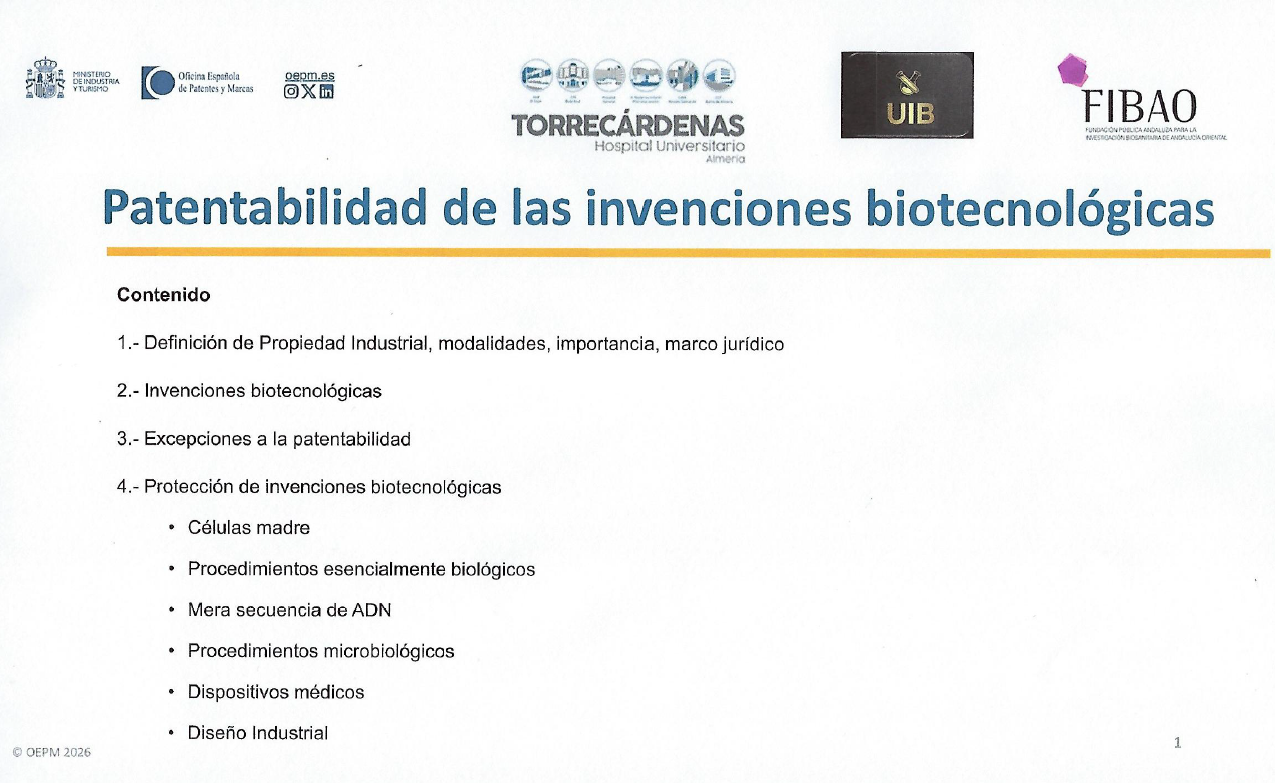 - Objetivo de la jornada: Dar a conocer los fundamentos de la propiedad industrial y el marco jurídico aplicable a las invenciones biotecnológicas, así como sus límites, excepciones y estrategias de protección en el ámbito biosanitario.