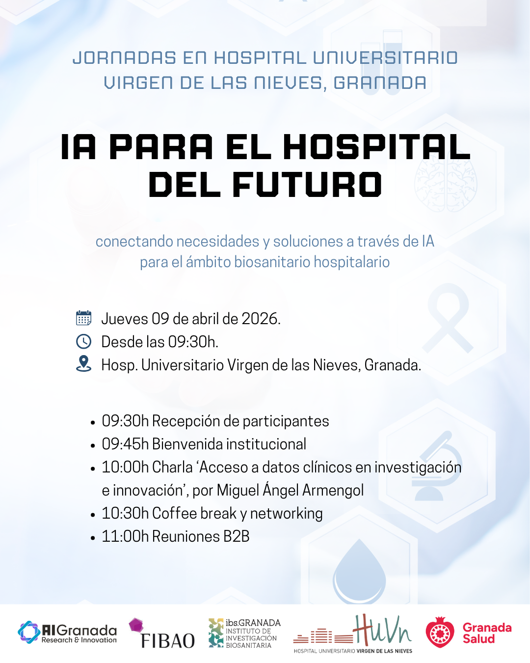 El próximo jueves 9 de abril se llevará a cabo el evento "IA para el Hospital del Futuro", un encuentro diseñado para unir a las Unidades de Gestión Clínica (UGC) del Hospital Universitario Virgen de las Nieves con grupos de investigación en Inteligencia Artificial y Ciencia de Datos.